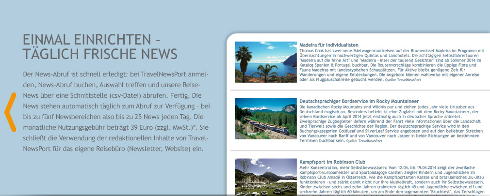 * Für Reisebüros, die einen Premium-Account bei TravelNewsPort nutzen, ist der News-Abruf in der Monatsgebühr enthalten. Sonderkonditionen sind für einige Kooperationen verfügbar.